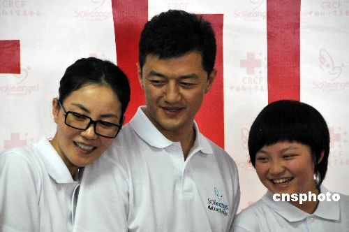 資料圖:五月十一日上午,由王菲、李亞鵬夫婦等護送的三位災區孩子返回北川家鄉,這是『汶川新家庭』助養計劃的第一批孩子。圖為王菲、李亞鵬夫婦和他們救助的北川中學學生朱春燕(右)合影。中新社發唐偉傑攝