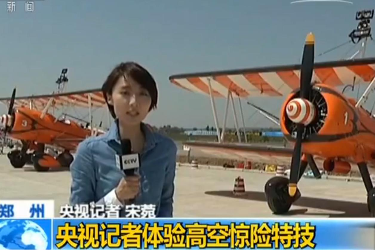 央視記者在專業表演者的協助下爬上頂層機翼,並配備了完善的安全保障措施。