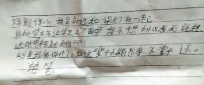 陳先生通過微信給記者傳來一張圖片,上面是寫了四行字的橫格紙,最後寫了兩個字———『絕筆』。這是孩子在墜樓之前留下的疑似『遺書』。『媽,別傷心,我會永遠和你們在一起。這所學校讓學生上2周學,我不想,所以我死這想這所學校就關門吧!媽爸我愛你們,我這輩子不能盡孝,下輩子還。絕筆。』周同學的弟弟在萬順鄉中學讀初一,他介紹,學校說這個周六日(2日和3日)會進行補課。『他弟弟每個星期六、日都會回家,而哥哥就是偶爾纔會回家。聽弟弟說這周哥哥是要補課的。』陳先生說。