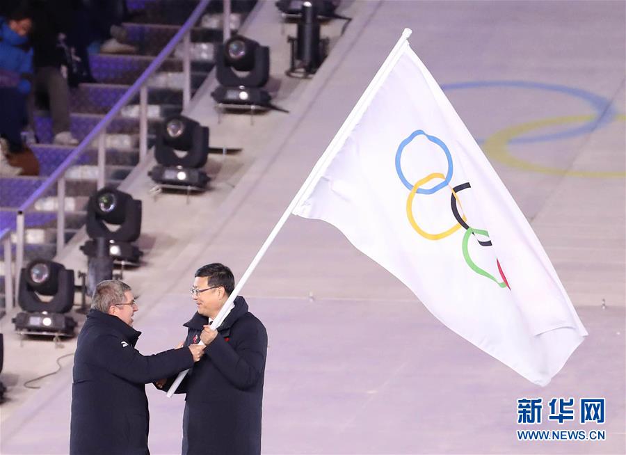 2月25日,北京市市長陳吉寧(右)從國際奧委會主席巴赫手中接過奧林匹克會旗。當日,2018年平昌冬奧會閉幕式在平昌奧林匹克體育場舉行。新華社記者白雪飛攝