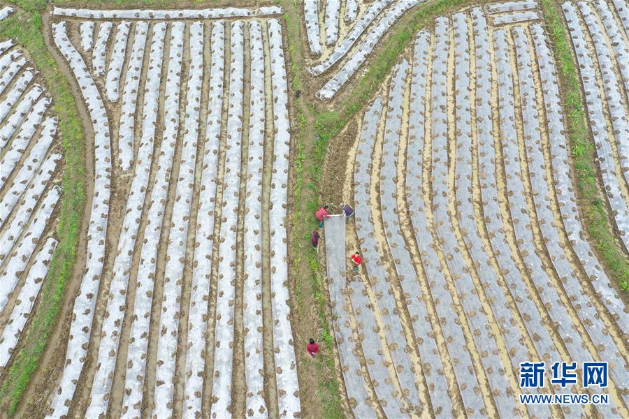 3月19日,湖南省永州市道縣梅花鎮車頭村村民在田間忙碌(無人機拍攝)。春分將至,各地農民搶抓農時春耕春播,田間地頭到處是一派繁忙景象。新華社發(何紅福攝)