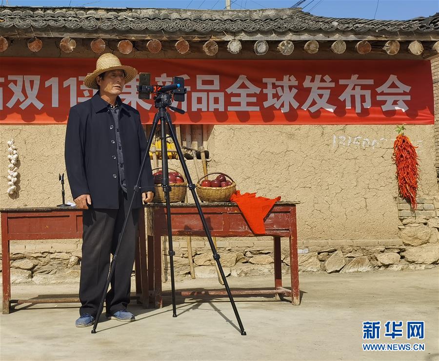 10月31日,甘肅省隴南市禮縣永興鎮農民張加成在『苹果新品發布會』上直播帶貨。新華社發