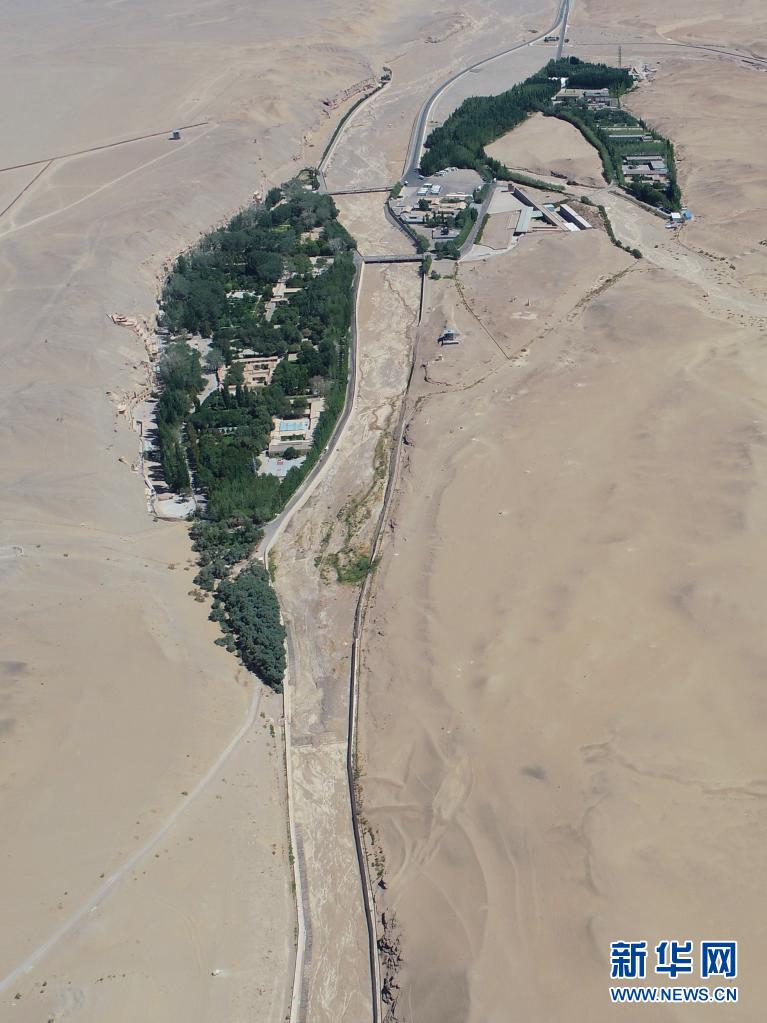 大泉河及其流經的敦煌莫高窟(7月6日攝,無人機照片)。新華社記者劉詩平攝