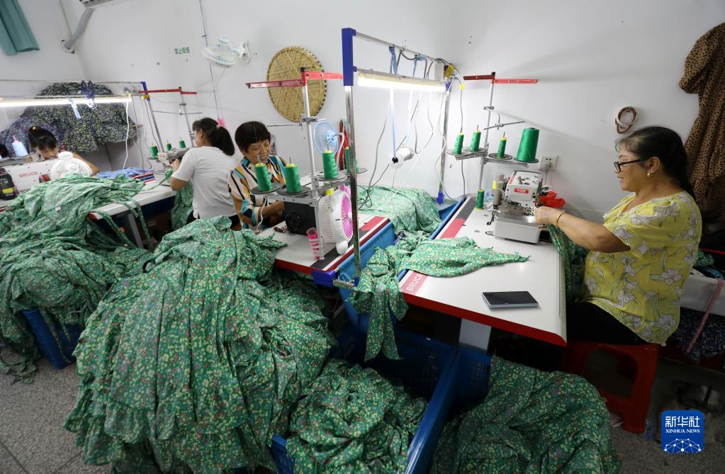 9月8日,在湖南省資興市唐洞街道茶坪瑤族村一家服裝廠,村民在制作服裝。