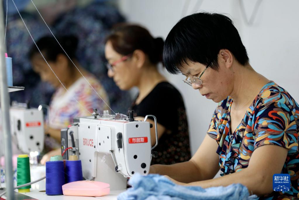 9月8日,在湖南省資興市唐洞街道茶坪瑤族村一家服裝廠,村民在制作服裝。