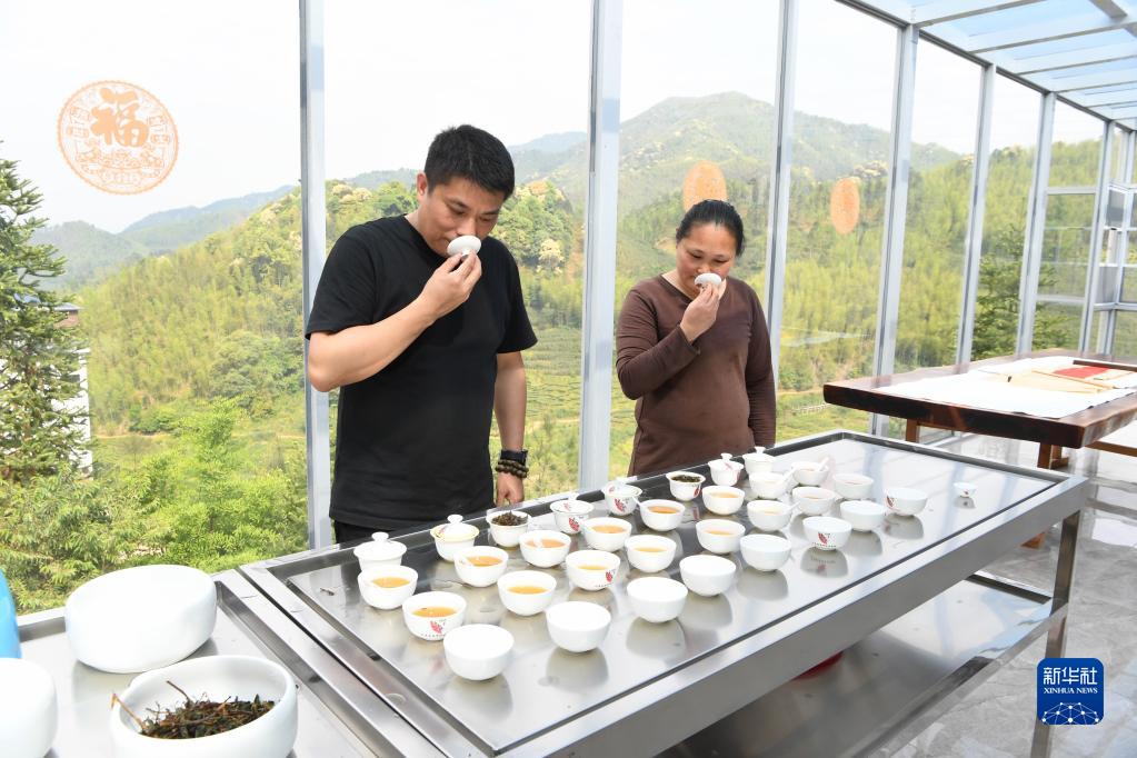 5月7日,吳三地茶農佔興旺夫婦在審評剛制作的毛茶。